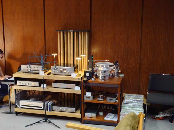 ここは他のブースに比べて部屋の雰囲気がいいです。ライトアップの仕方と管球の組み合わせ、木目調の壁に木製のスピーカーとラック類、日本音響エンジニアリングのAGSとがマッチしていて、低い座席にゆっくりと座って試聴している方多かったですね。