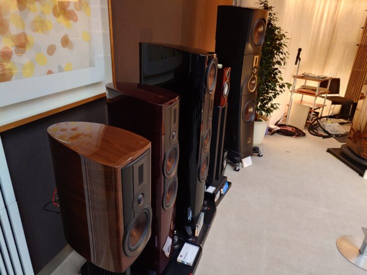 私も愛用しているDALI、その新製品たち。奥が旗艦モデルKORE、その手前は新製品のようですが、KUPIDのスピーカーかな?EPIKORE 9/EPIKORE 7/EPIKORE 3と思われます。