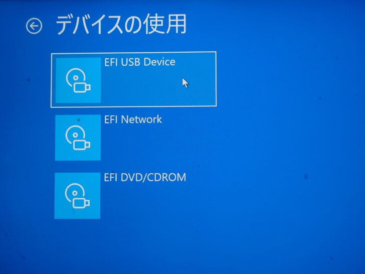 「オプションの選択」から「デバイスの使用」を選択し、「EFI USB Device」を選択して、USBメモリをブートディスクとして起動して、Windows10をインストールしました。