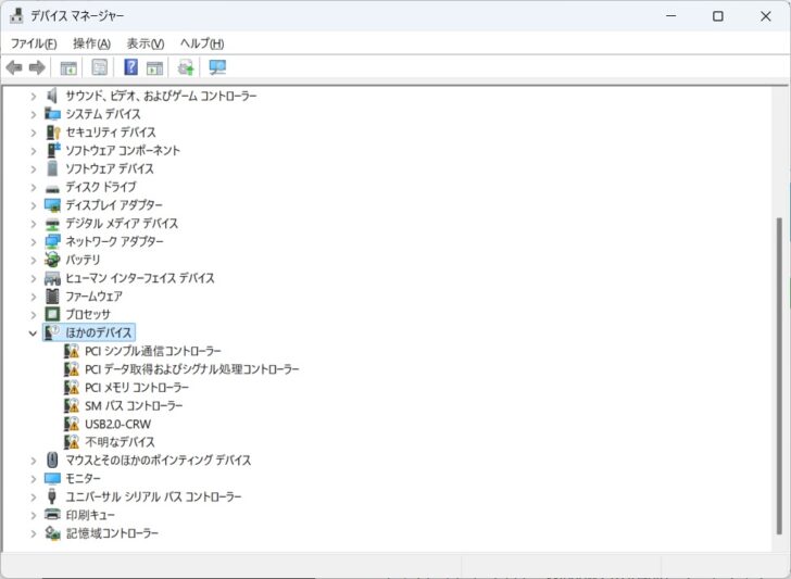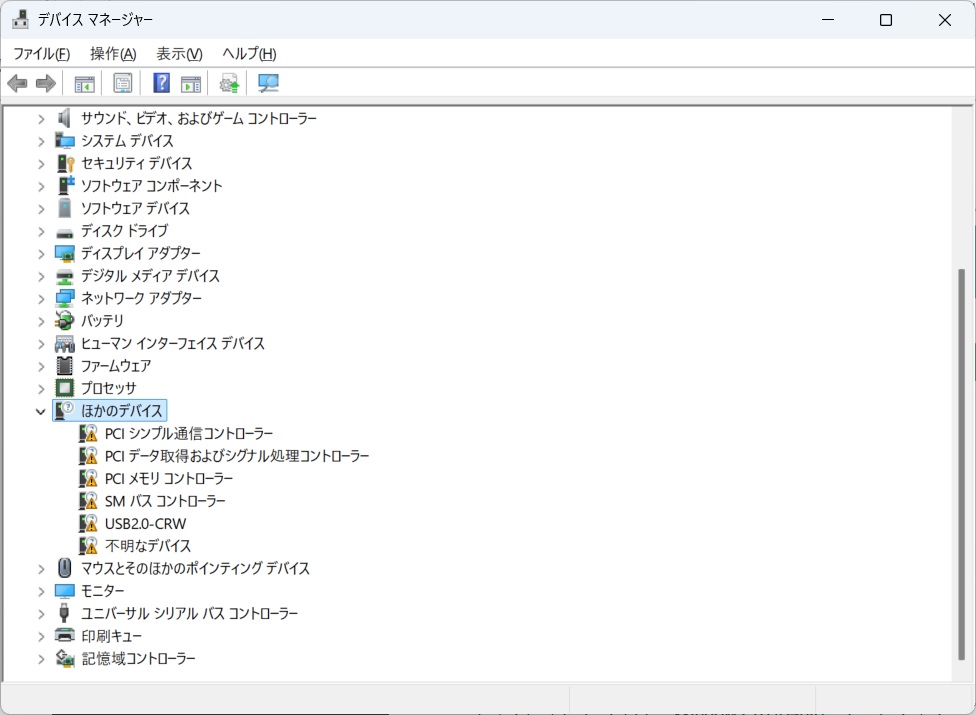 デバイスマネージャーを確認すると、いくつかドライバーの不足はありました。