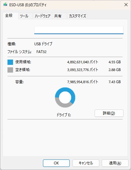 インストールメディアに使用するディスク容量については、8GB以上が推奨されていましたが、実際のインストールメディアの容量は5GB未満でした。