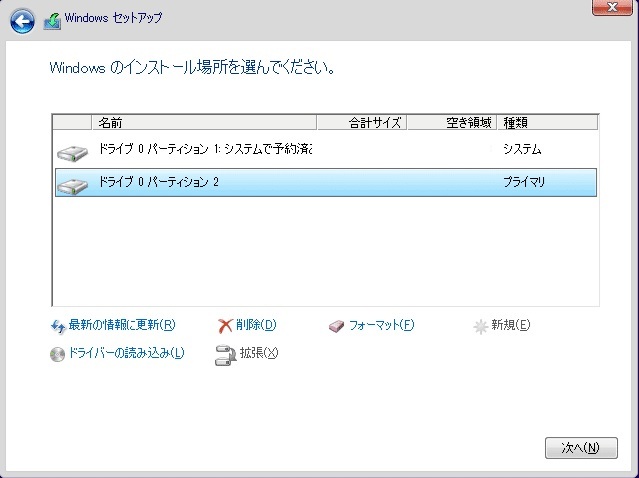 Windowsセットアップというウィンドウが起動すると、最初にインストールするパーティションを選択する画面が表示されます。
